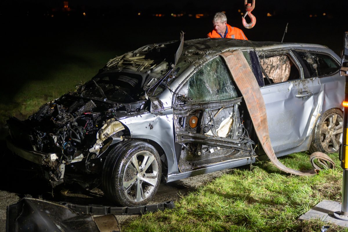 Een berger heeft het voertuig uit het water getakeld. De zwaar beschadigde auto is vervolgens afgevoerd.