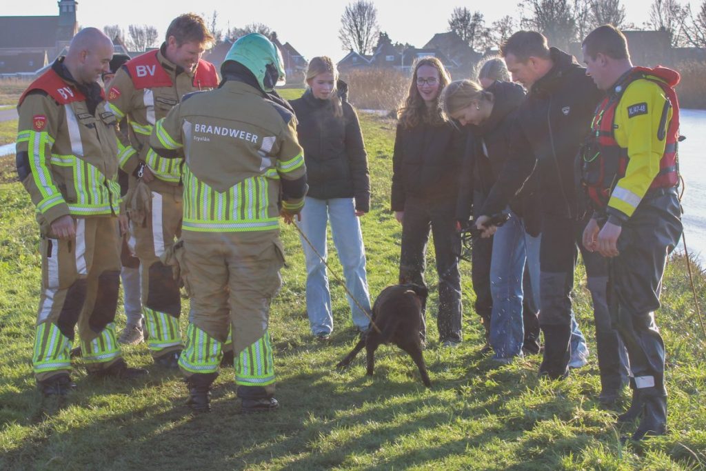 Korps Heeg was snel ter plekke. De brandweerlieden zijn erin geslaagd om het dier weer op het droge te krijgen. Na even flink schudden konden de hond en baasjes hun wandeling weer vervolgen.
